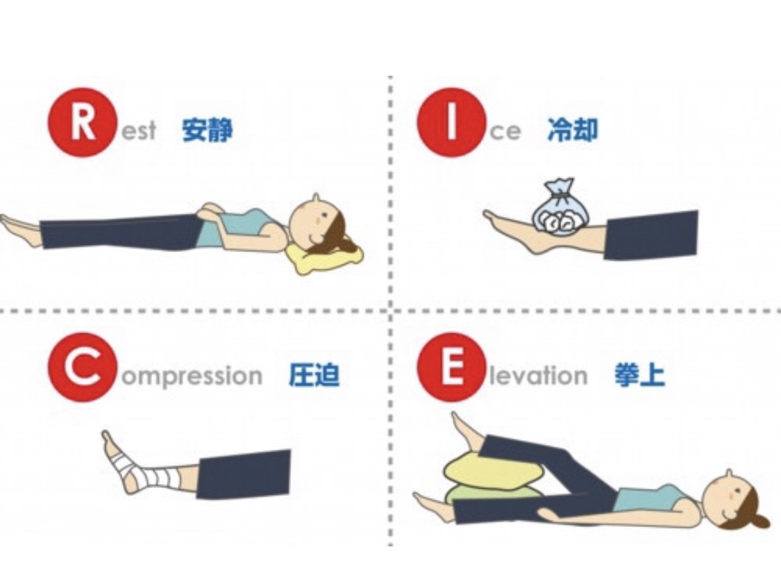 ・(E)levation:挙上 ⇒患部(ケガをした箇所)を心臓より高くし、腫れを引かせる。