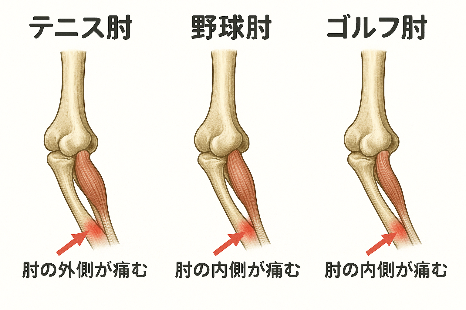 主に「野球肘」「テニス肘」「ゴルフ肘」が聞き覚えのある方は多いと思います。